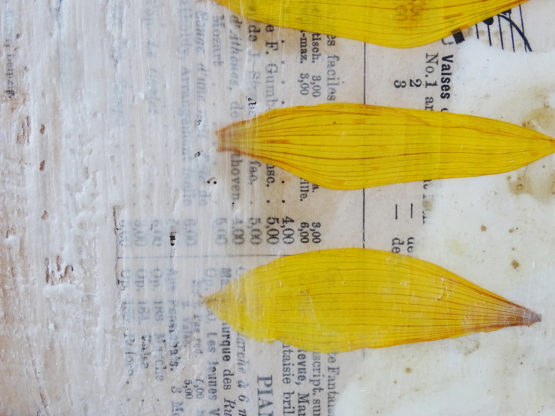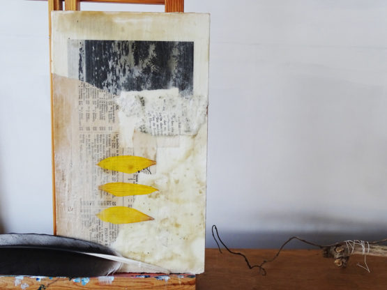 ‘Capturing Time’: mixed media collage op houten plaat met een laag van wax als finish.